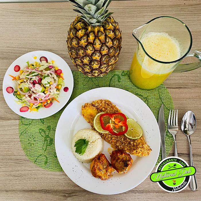 Robalo Panameño (filete de pescado blanco apanado en hojuelas de avena), arroz blanco, yuca en salsa criolla, ensalada griega (vegetales).