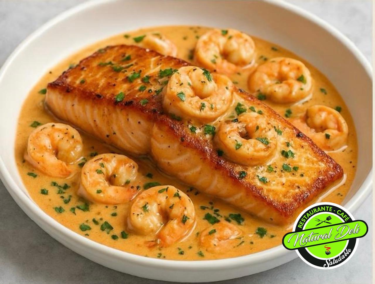 Salmón en salsa de camarón (250 gramos de salmón al horno con salsa de camarón), arroz blanco, papa a la francesa, ensalada Gourmet (vegetales)