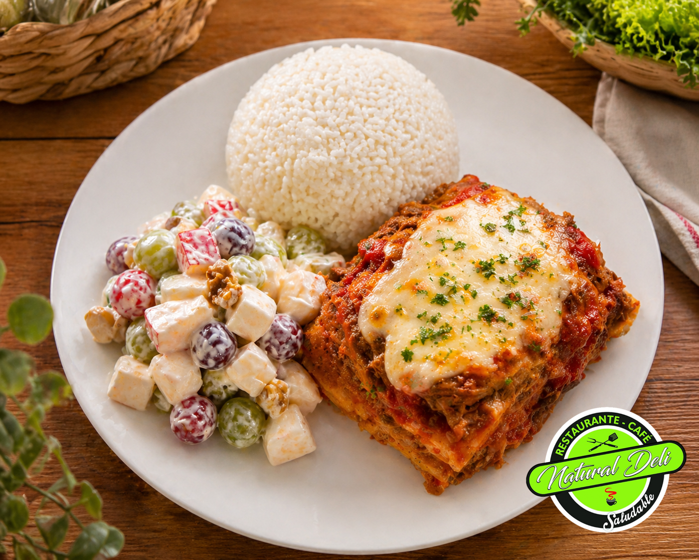 Steak Valluno (Lasaña de plátano maduro con sobrebarriga desmechada en salsa criolla y queso mozarella), arroz blanco y ensalada waldorf (frutal).