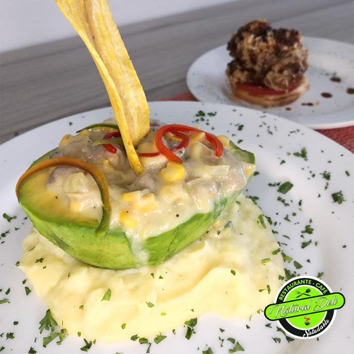 Aguacate relleno (medio aguacate sobre cama de puré de papa, relleno de pasta tornillos con champiñón, proteína de soya y vegetales, decorado con chips de plátano verde), arroz blanco y ensalada frutal (dulce).