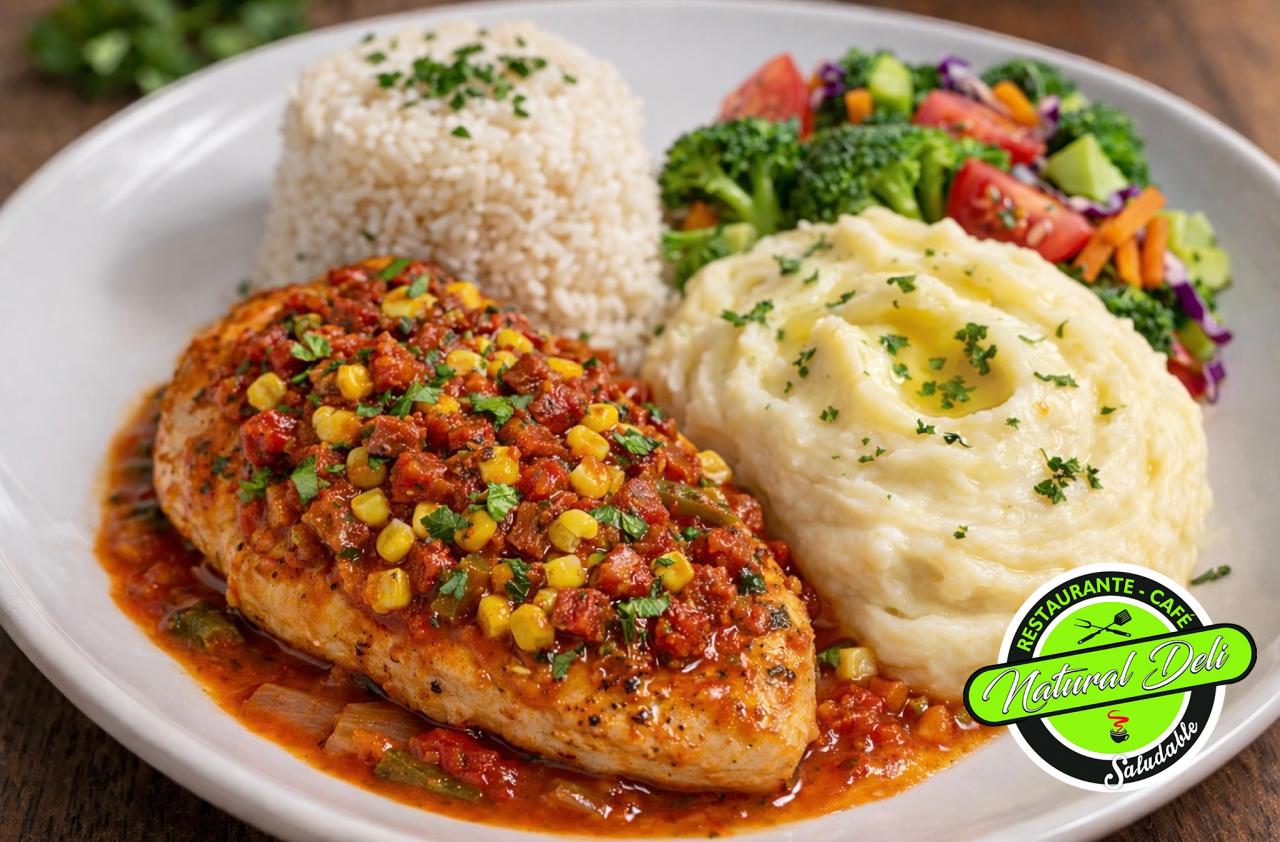 Pechuga en salsa ranchera (a la parrilla con salsa criolla, maíz, chorizo), arroz blanco, puré de papa, ensalada frutal (dulce).