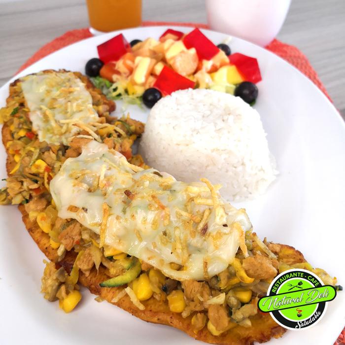 Tostón de plátano (patacón pisao relleno de proteína de soya, champiñón, vegetales, papa fosforito y queso mozarella), arroz blanco, ensalada californiana (frutal).