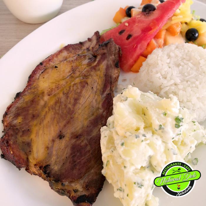 Bondiola de cerdo al horno (corte de carne de cerdo al horno asada en sus jugos con almíbar de piña), arroz blanco, papa jardinera, ensalada californiana (frutal).