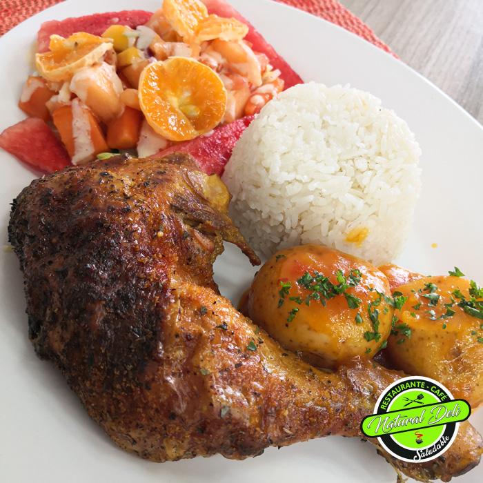 Pierna pernil a las finas hierbas (al horno asado en sus jugos y especias), arroz blanco, papa al perejil, ensalada californiana (frutal).