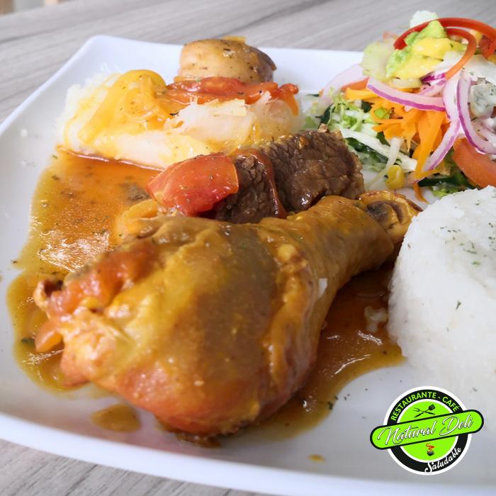 Guiso Santandereano (sudado de pollo y carne), yuca y papa con hogao, arroz blanco y tajada de aguacate.