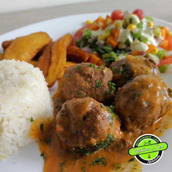 Albóndigas de carne atomatadas (tres unidades de albóndigas en su salsa), arroz blanco, lengüetas de plátano maduro, ensalada clásica (vegetales).