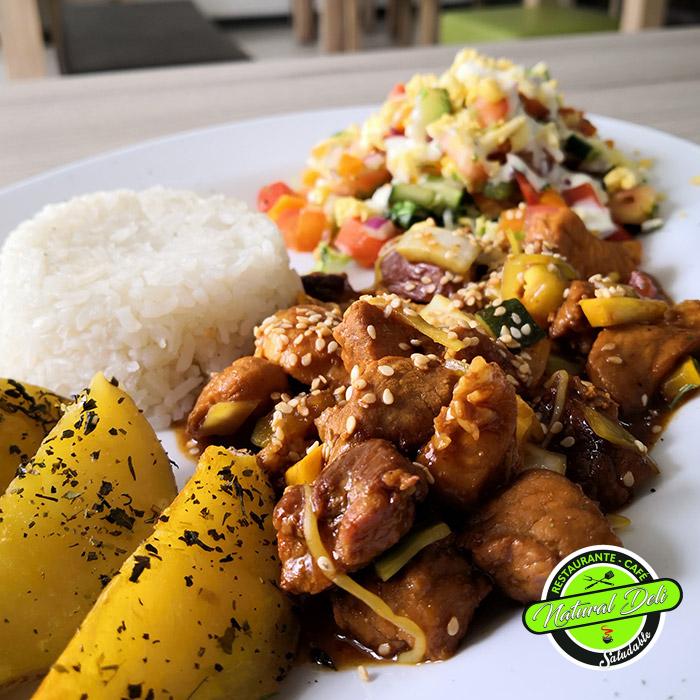Chop Suey de cerdo (cubos de carne de cerdo salteados con vegetales orientales y salsa teriyaki), arroz blanco, puré de papa, ensalada clásica (vegetales).