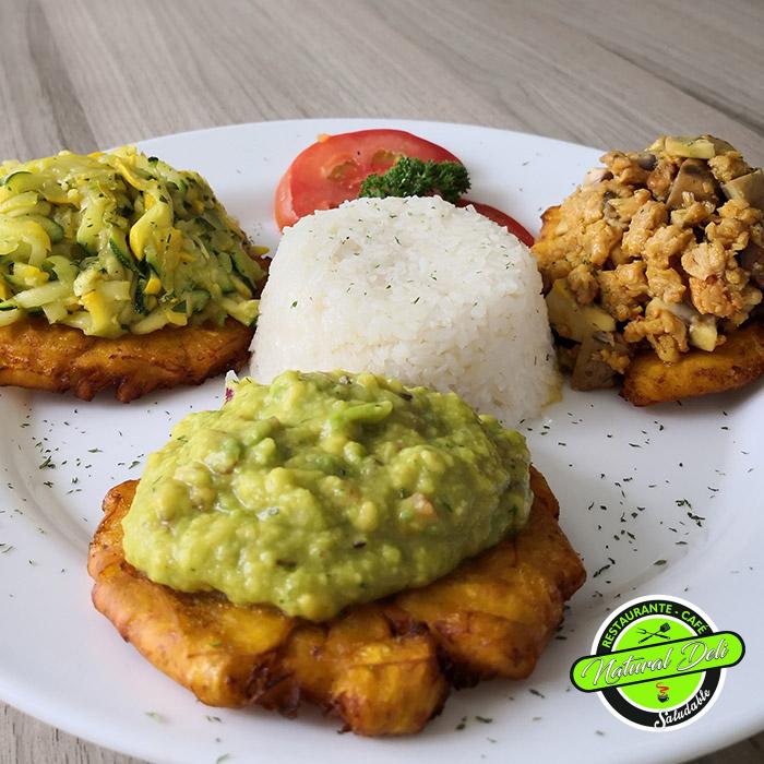 Festival pataconero (tres unidades de plátano con vegetales, proteína de soya, champiñón y guacamole), arroz blanco, ensalada californiana (frutal).