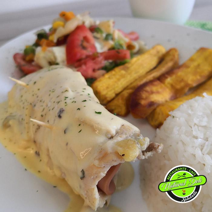 Rollo de pechuga primavera (rellena de jamón y queso en salsa bechamel con vegetales), arroz blanco, cascos de papa frita, ensalada griega (vegetales).